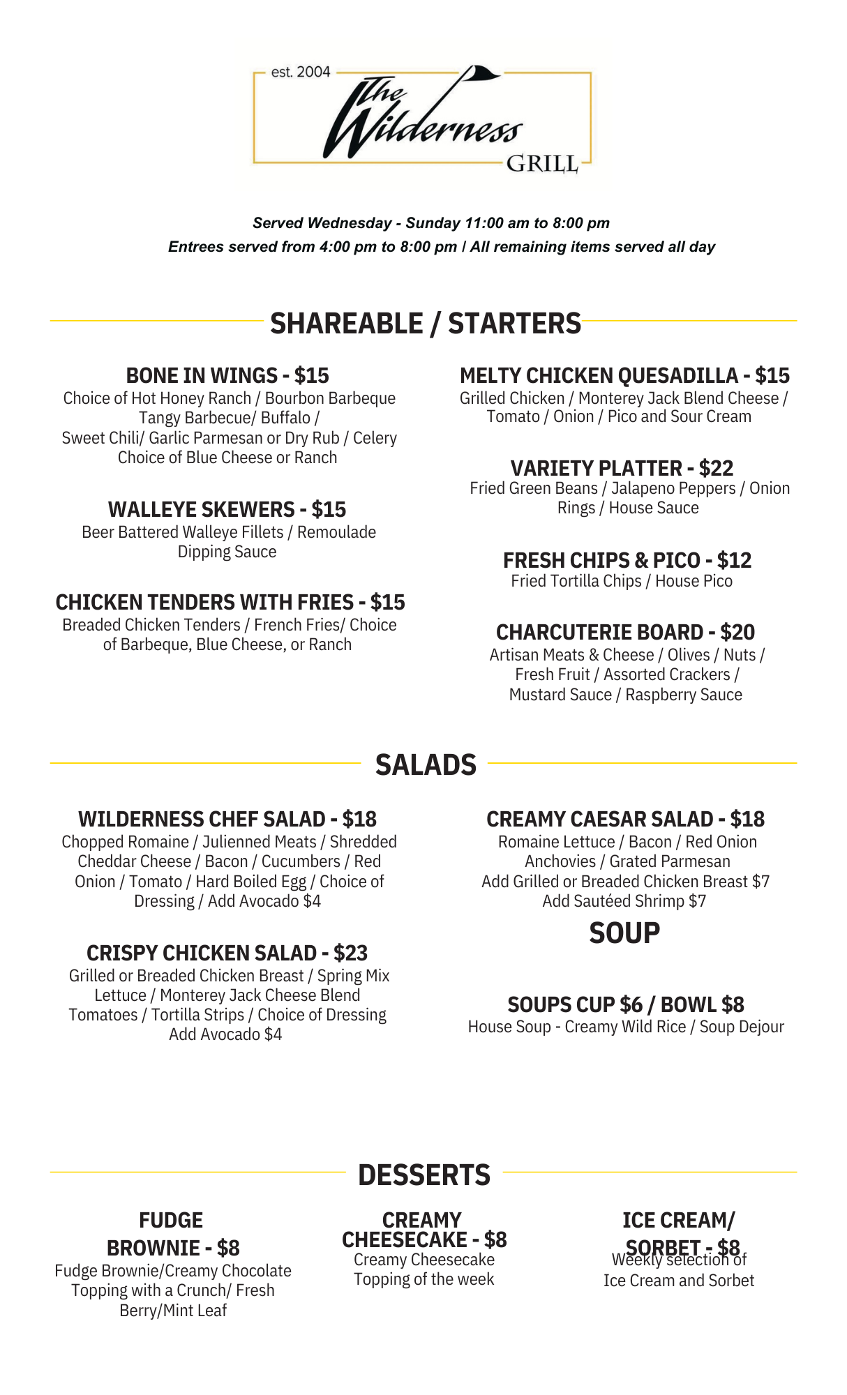 2025wildernessmenu.pdf Breakfast Menu Breakfast Menu Lunch & Dinner Lunch & Dinner Menu Patio Grill Menu Wine & Cocktails Wine List Cocktail List